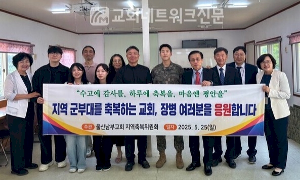 울산남부교회(김대현 목사 시무) 지역축복위원회는 5월 25일 주일, 지역 군부대를 방문해 장병들을 위한 따뜻한 응원과 축복의 메시지를 전하며 은창교회(조현 목사 시무) 예배 선물을 전달했다.